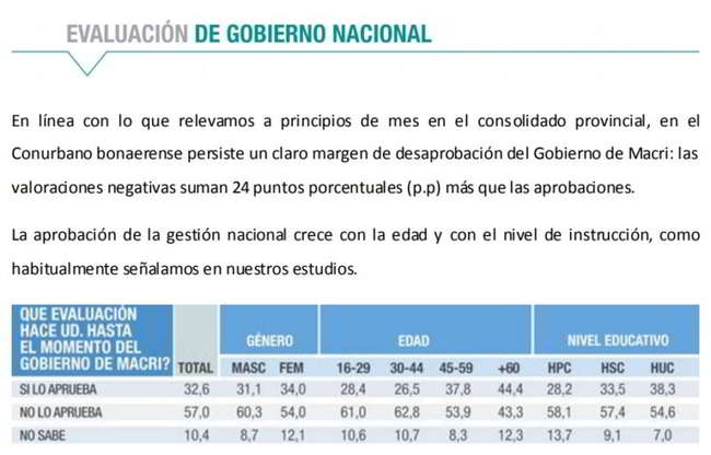 “La aprobación de la gestión nacional crece con la edad y con el nivel de instrucción, como habitualmente señalamos en nuestros estudios”, indica el informe.