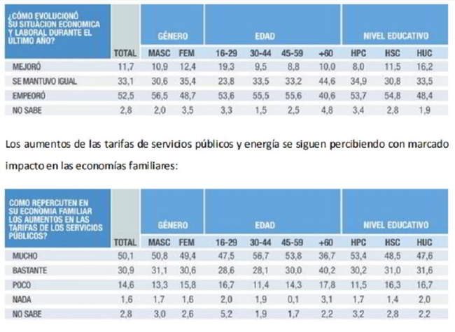 La misma línea siguió en la siguiente consulta acerca de la repercusión que tienen un sus familias los aumentos en las tarifas de los servicios públicos. Un 81% indicó que el incremento repercute “entre bastante y mucho”.