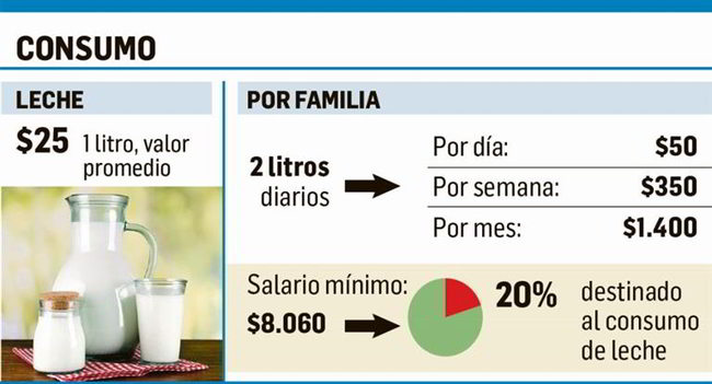 Considerando que una familia tipo puede llegar a consumir 2 litros diarios, se trata de $50 por jornada, lo que podría traducirse en unos $350 semanales, es decir, unos $1400 mensuales. En rigor, el cálculo Organización de las Naciones Unidas para la Alimentación y la Agricultura (FAO) recomienda como mínimo 500 mililitros por jornada por niño, ya que un vaso de leche (200 ml) aporta aproximadamente un 30% de la dosis diaria de calcio recomendado, nutriente que ayuda a formar y mantener huesos y dientes fuertes, además de su rol en la función nerviosa. Puesto de esta manera, la primera de las lecturas que puede hacerse es que una familia puede llegar a gastar hasta un 20% de su salario mensual solamente para comprar leche (aunque en las últimas horas se fijó un aumento, el salario mínimo era de $8.060).