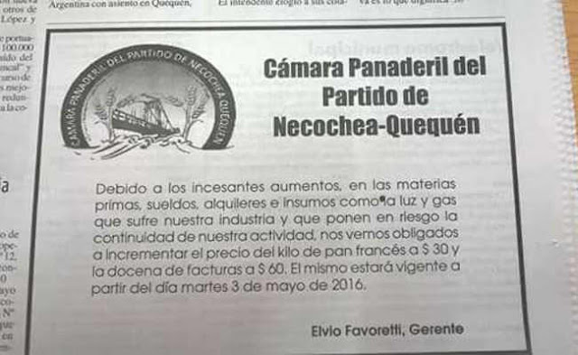 La Cámara Panaderil del Partido de Necochea publicó un anuncio en el matutino local en el que comunica que «debido a los incesantes aumentos en las materias primas, sueldos, alquileres e insumos como la luz y el gas», el kilo de pan francés pasará a costar $30.