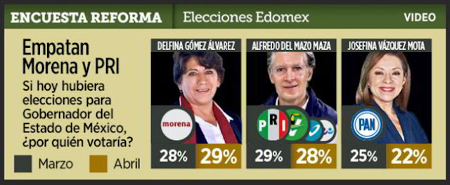 Debajo —aún en empate técnico— está el primo del presidente, Alfredo del Mazo, quien es postulado por el PRI y tres partidos más, con 28 por ciento. Y en un rezagado tercer lugar, con 22 por ciento, está la excandidata presidencial Josefina Vázquez Mota, del conservador Partido Acción Nacional.