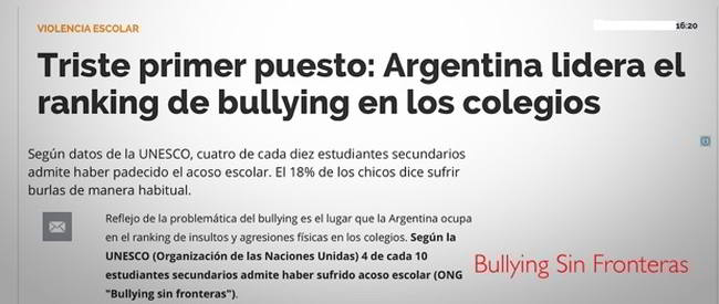 Reflejo de la problemática del bullying es el lugar que la Argentina ocupa en el ranking de insultos y agresiones físicas en los colegios. Según la UNESCO (Organización de las Naciones Unidas) 4 de cada 10 estudiantes secundarios admite haber sufrido acoso escolar (ONG «Bullying sin fronteras).
