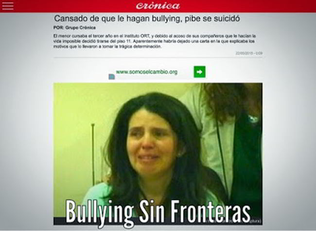 ‘Hemos llegado a un peligroso punto de dificil retorno con relación al bullying en la República Argentina. Mientras damos a conocer este informe conjunto con UNESCO, los medios argentinos reflejan el caso de Alejandro un chico adolescente de un colegio del barrio de Flores en la Ciudad de Buenos Aires que fue salvajemente golpeado por sus compañeros, causándole una lesión cerebral por lo que será operado en las próximas horas. Hace tiempo Francisco Rodriguez de 15 años, quien cursaba sus estudios en el Instituto ORT de Montañeses y Congreso en el porteño barrio de Nuñez, se suicidó arrojándose desde un piso 11º donde vivía. La Fiscalía de Saavedra Nuñez que investiga los hechos, tuvo acceso a una carta de despedida donde Francisco pone al bullying en el colegio que sufría como causa del desenlace fatal. El Instituto ORT nunca hizo declaraciones al respecto. Así está el bullying en Argentina, lastimando e incluso matando a nuestros chicos. Mientras las autoridades responsables miran de soslayo e incluso hacen todo lo posible por taparlo y esconderlo’, dijo el Dr. Javier Miglino, Fundador de la ONG Internacional Bullying Sin Fronteras.