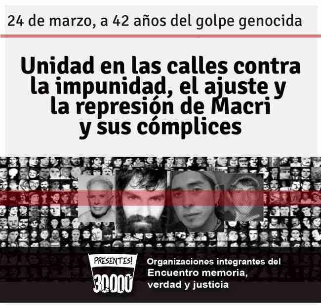 Las organizaciones, abajo firmantes, integrantes del Encuentro Memoria, Verdad y Justicia convocamos a nuestro pueblo a repudiar, como todos los años, en forma independiente de los gobiernos, el golpe genocida del 24 de marzo de 1976.