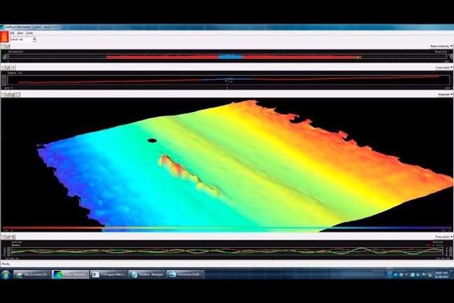 Mediante la ecosonda multihaz que posee el moderno buque, se divisó un blanco de sonar de forma alargada ubicada sobre el fondo con dimensiones de aproximadamente 62 metros de largo, altura sobre el fondo de 13 metros y 11 metros de altura sobre el fondo.