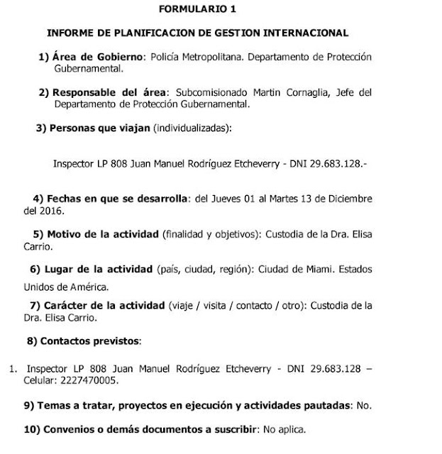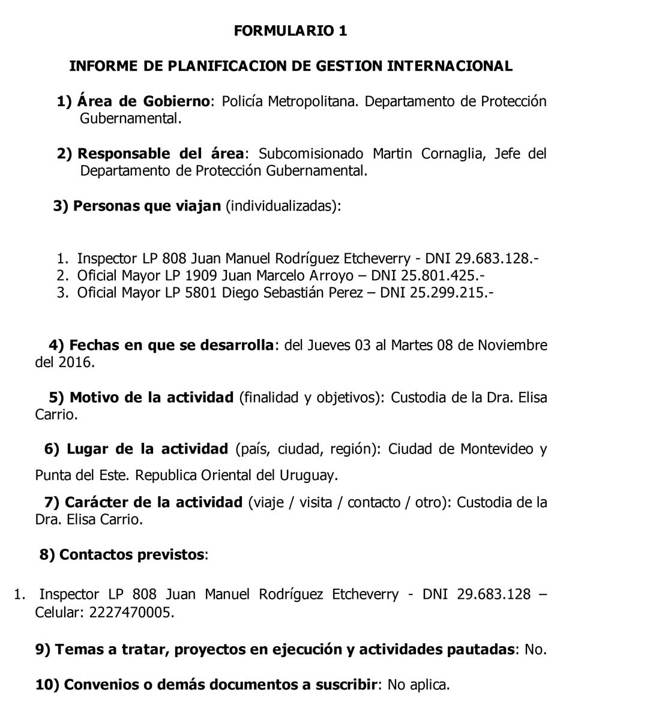 El Inspector Juan Manuel Rodríguez Etcheverry acompañó a Carrió al país del norte y, según lo establecido en la Resolución Nº 2174/MHGC/16, ya recibió la suma de pesos veintisiete mil cuatrocientos dieciocho ($ 27.418.-) para su pasaje.