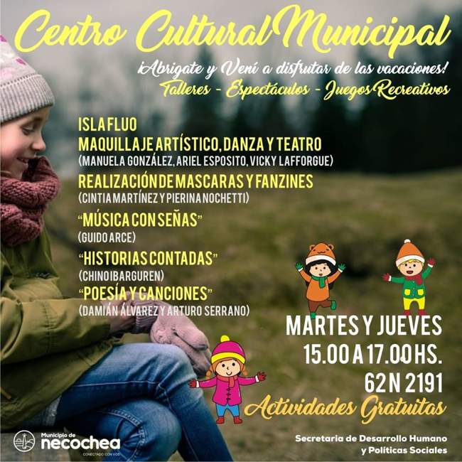 Buscando brindar distintas alternativas para que niños y adolescentes puedan aprovechar las próximas vacaciones de invierno en espacios en los que se diviertan y eduquen al mismo tiempo, el Centro Cultural Municipal de Necochea preparó un cronograma repleto de talleres gratuitos para las próximas dos semanas de julio.