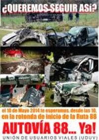 Los vecinos agrupados en la Unión de Usuarios Viales (UDUV) organizan para el 10 de mayo una movilización para reclamar la construcción de la autovía en la ruta 88.Será la primera manifestación de la campaña de firmas que se pondrá en marcha ese día, para elevar una nueva petición escrita ante el gobierno de Daniel Scioli, exigiendo la concreción de esta necesaria obra.»La idea es apostarnos en la rotonda de la Circunvalación, sin cortar el tránsito, y en la oportunidad entregar panfletos a los automovilistas”, manifestó Leonardo Giorgetti, integrante de la UDUV, a la vez que anticipó que «a diferencia de anteriores gestiones, las que llevaremos adelante de aquí en más tendrán continuidad en el tiempo”.