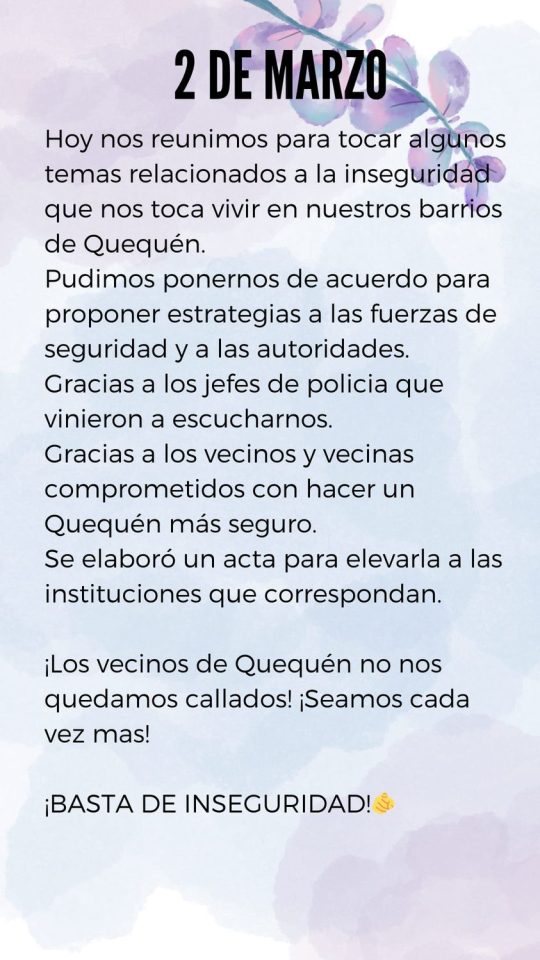 Quequén no se rinde. Los vecinos del barrio Seis Esquinas han alzado la voz y han puesto sobre la mesa sus demandas. Más luminarias, lomos de burro, cámaras de seguridad, presencia policial. Son medidas concretas que podrían marcar la diferencia pero es necesario que las autoridades escuchen y actúen. No podemos permitir como comunidad que la inseguridad siga ganando terreno en nuestras calles.