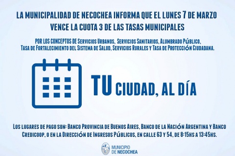 La Municipalidad de Necochea informó que este lunes 7 de Marzo, vence la cuota 3 de las Tasas Municipales, por los conceptos de Servicios Urbanos, Servicios Sanitarios, Alumbrado Público, Tasa de Fortalecimiento del Sistema de Salud, Servicios Rurales y Tasa de Protección Ciudadana.