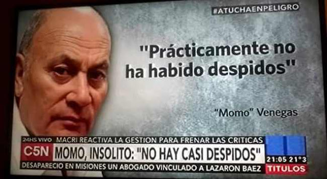 El titular de UATRE, Gerónimo «Momo» Venegas, y fan del PRO, relativizó la situación laboral y dijo que según datos del Gobierno «los primeros despidos fueron en lugares donde estaban superpoblados, y de gente que no trabajaba». En realidad ya son unos 130 mil.