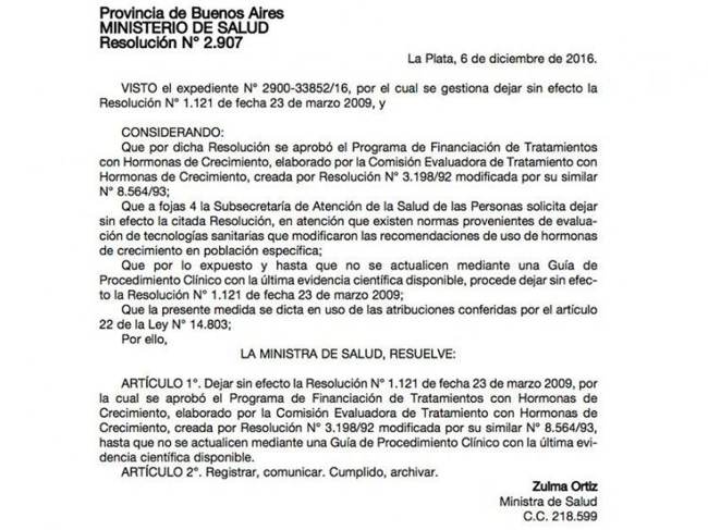 La Resolución 2907 del Ministerio de Salud de la Provincia, cuya ministro es Zulma Ortíz, ordenó “dejar sin efecto la Resolución 1121 del 23 de marzo de 2009″, en la cual se “aprobaba el Programa de Financiación de Tratamientos con Hormonas de Crecimiento”.