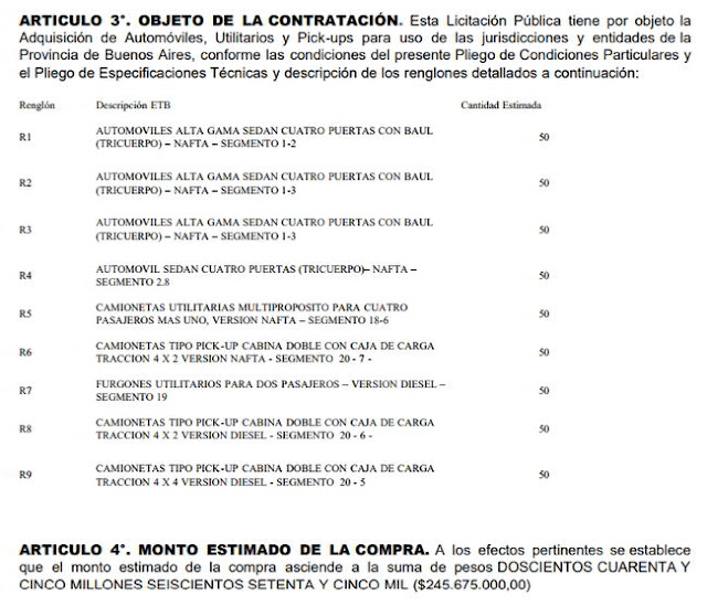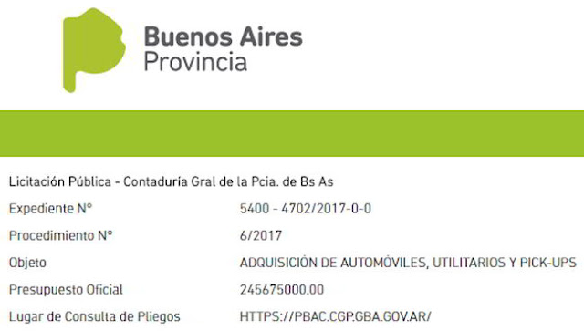 A través de la Licitación Pública de la Contaduría Gral de la Pcia. de Bs As bajo el Expediente N° 5400 4702/2017-0-0, Procedimiento N° 6/2017 con el Objeto: “ADQUISICIÓN DE AUTOMÓVILES, UTILITARIOS Y PICK-UPS” el gobierno de Vidal se lanzó a la compra de 250 vehículos de alta gama.