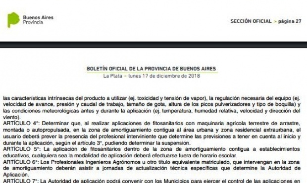 En el artículo 5 de la resolución se estipula que «la aplicación de fitosanitarios dentro de la zona de amortiguamiento contigua a establecimientos educativos, cualquiera sea la modalidad de aplicación, deberá efectuarse fuera de horario escolar».