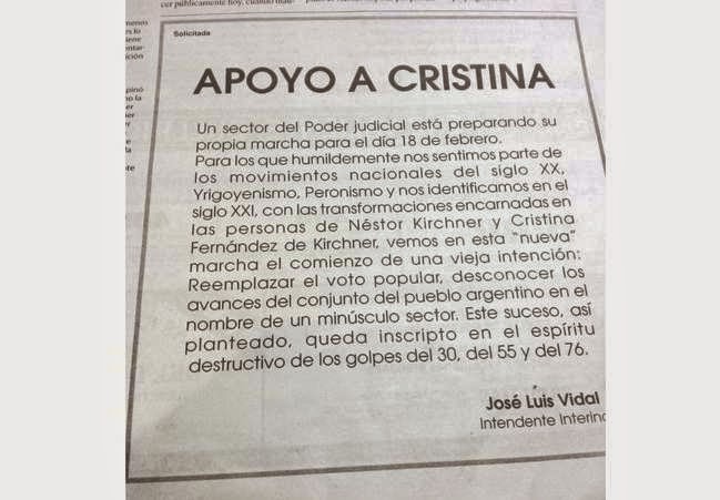 «Apoyo a Cristina» es el título que encabeza la comunicación del intendente interino José Luis Vidal sobre la marcha de pedido de justicia por la muerte del Fiscal federal Alberto Nisman.