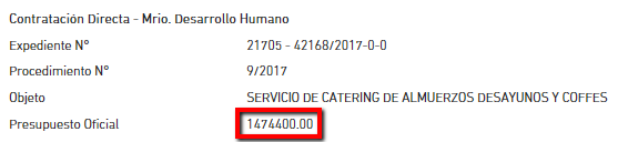Vidal elige darse sus gustos, y para la contratación directa del Ministerio Desarrollo Humano Expediente N° 21705 – 42168/2017-0-0 Procedimiento N° 9/2017 cuyo objeto es “SERVICIO DE CATERING DE ALMUERZOS DESAYUNOS Y COFFES” asignó un presupuesto de $1.474.400 válido para 8.030 asistentes a 225 coffee-breaks (casi 1 por día laboral en el año). La Gobernadora aseguró un gasto de $183,60/persona, para que nadie se quede sin probar su “morenito de jamón crudo, rúcula y parmesano” acompañado de “sacramentitos de muzzarella y jamón” y otras delicadezas que su paladar merece. En el mundo real, Vidal redujo las partidas alimentarias dejando solo en Bahía Blanca sin copa de leche a 3.439 niños.