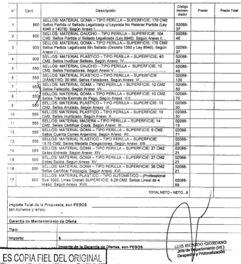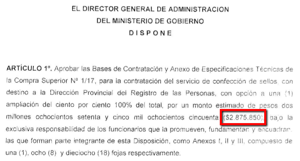 Otro caso es el de los sellos de goma de la Gobernación. La Licitación Pública del Ministerio de Gobierno según Expediente N° 2209 – 109374/2016-0-1 Procedimiento N° 1/2017 cuyo objeto es “ADQUISICION DE SELLOS” tiene un presupuesto de $2.875.850.