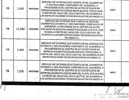 El catering de las fuerzas de Seguridad es otro escándalo. Según la Contratación Directa del Ministerio de Seguridad Expediente N° 21100 – 575133/2017-1-0 Procedimiento N° 25/2017 cuyo objeto es la “PRESTACIÓN DEL SERVICIO DE CATERING” para las fuerzas policiales, se presupuestaron $24.178.180,20 para 348.060 raciones.