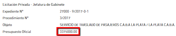 Pero esa no es la única orden de traslado, desde Jefatura de Gabinete se solicitaron 3 combis más a través del Expediente N° 27000 – 9/2017-0-1 Procedimiento N° 3/2017 esta vez con un presupuesto de $3.375.000 lo que da un valor diario de $2.691 por pasajero.