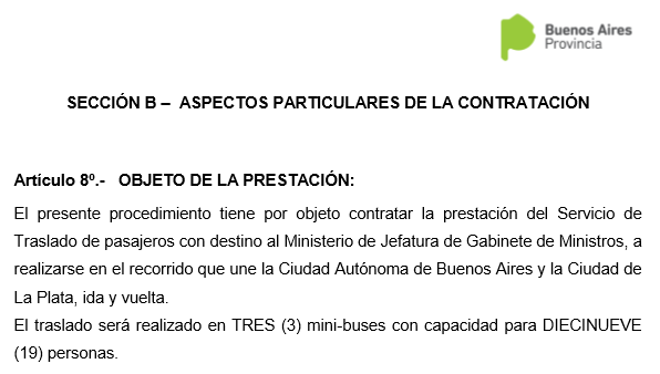 Una de las órdenes de Compra Directa de la Gobernación es el Procedimiento N° 4/2017 del Expediente N° 25000 – 212/2017-1-1 , Contratación Directa Unificada correspondiente a la SECRETARIA DE COMUNICACION cuyo objeto es el “TRASLADO DE PASAJEROS”. Para una combi que va de CABA a la Gobernación en La Plata a las 9 am y regresa a las 18:30h transportando diariamente a 19 almas laboriosas, Vidal asignó un presupuesto es de $1.500.000 lo que da un valor diario de $3.588 por pasajero. Este contrato es por el periodo comprendido de Marzo a Diciembre de 2017.