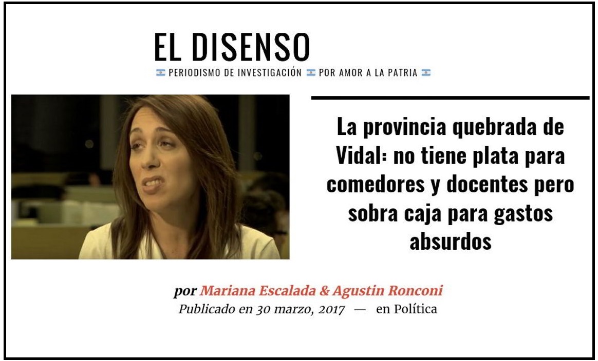 Ni bien asumió se mudó a un cuartel militar, redecoró el lugar, contrató a una modista y comenzó a trasladarse al trabajo en helicóptero. Mientras continua echándole la culpa al kirchnerismo por haber recibido una provincia quebrada y niega tener fondos para docentes y comedores escolares, hoy desde El Disenso te vamos a mostrar los millones que dilapida Vidal en viáticos, cafe, cortinas y “morenitos de jamón crudo, rúcula y parmesano”.