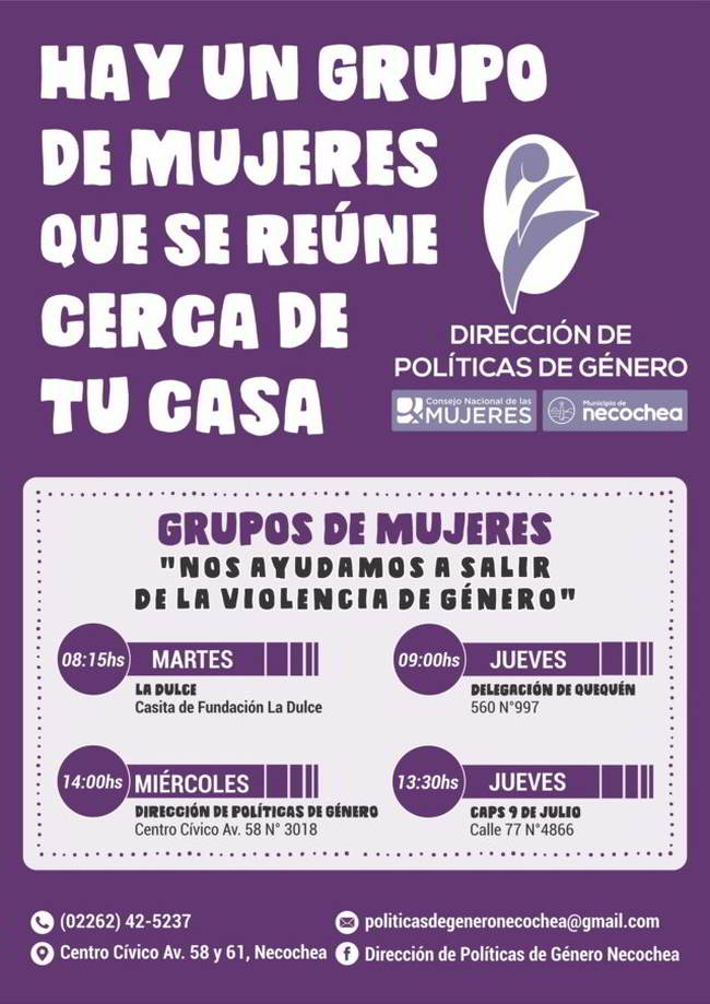 La Dirección de Políticas de Género, que depende de la Secretaría de Desarrollo Humano y se formó desde la gestión del intendente Facundo López, recuerda a la comunidad acerca de los Grupos de Reflexión sobre Violencia de Género, que funcionan en Necochea, Quequén y La Dulce.