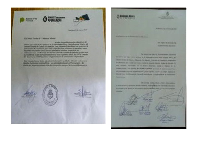 “El Consejo Escolar no autoriza la entrada de personal que no haya sido nombrada según las reglamentaciones y leyes vigentes”, dice el escrito con fecha de hoy que responde a los “dichos públicos” de Vidal y su ministro Alejandro Finocchiaro, que cita como referencia la ley 10.579, Estatuto del Docente; y la Ley 10.430 de Auxiliares y Reglamentación de Asociaciones Cooperadoras.