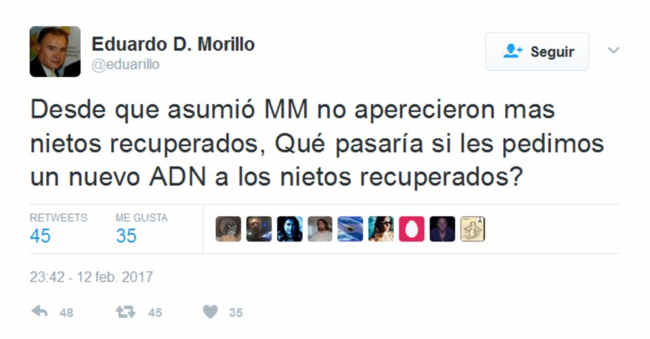 El domingo pasado por la noche, el dirigente del PRO Chubut Eduardo Morillo, escribió en su cuenta de Twitter un polémico comentario sobre los nietos recuperados.