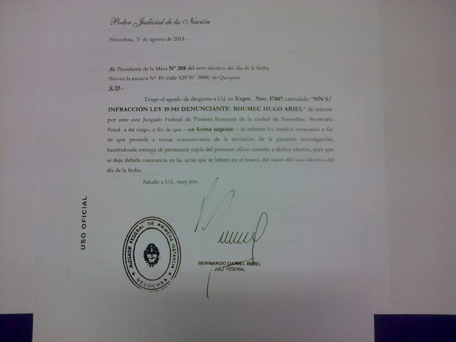«Interrogado por sus datos personales, el denunciante dijo llamarse de nombre Hugo Ariel Roumec, DNI 20254782, domiciliado en 549 Nº 374 de Quequén, de estado civil separado, sabe leer y escribir y de profesión comerciante pochoclero, de nacionalidad argentina.