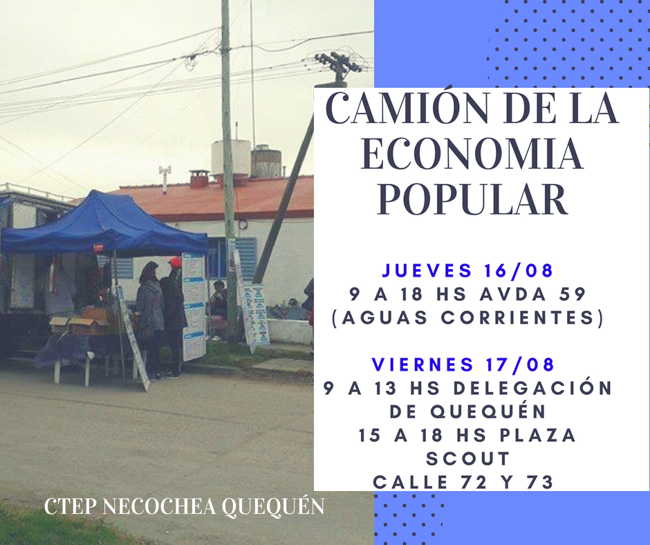 El jueves 16 y viernes 17 de agosto estará nuevamente en nuestro distrito el Camión de la Economía Popular perteneciente a la CTEP (Central de Trabajadores de la Economía Popular) gestionado por el Movimiento Evita Necochea – Quequén.