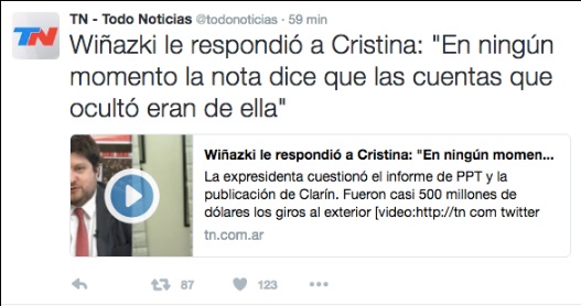 «La nota, en ningún momento, dice que las cuentas que ocultó eran de ella o de su familia en el exterior», así le respondió Nicolás Wiñazki a los furiosos tuits que publicó Cristina Kirchner cuestionando los Cristileaks que difundió Periodismo para todos y que llevan la firma del periodista en el diario Clarín.