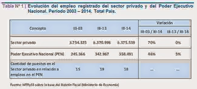 Pero lo más importante aún es que a pesar de las alarmas que dispara habitualmente este medio de comunicación sobre la expansión del empleo público desde el año 2003, la participación del mismo en el total del empleo asalariado registrado no sólo no creció exponencialmente, sino que cayó. Para probar esta afirmación se señala que en 2003 había 15 puestos de trabajo en la actividad privada por cada empleo en el PEN. Once años después, en 2014, se contabilizan más empleos del sector privado por puesto del ámbito público: 18 empleos privados por cada empleo público en el Poder Ejecutivo Nacional.