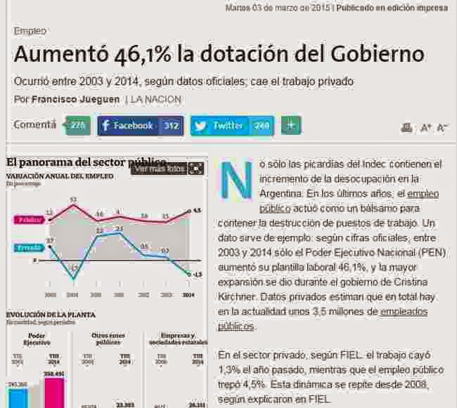 «No sólo las picardías del INDEC contienen el incremento de la desocupación en la Argentina. En los últimos años, el empleo público actuó como un bálsamo para contener la destrucción de puestos de trabajo. Un dato sirve de ejemplo: según cifras oficiales, entre 2003 y 2014 sólo el Poder Ejecutivo Nacional (PEN) aumentó su plantilla laboral 46,1%, y la mayor expansión se dio durante el gobierno de Cristina Kirchner». Así comienza una nota publicada en el diario La Nación de esta semana.