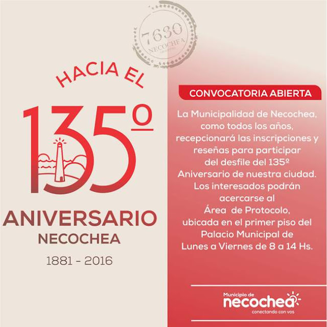 Falta cada vez menos para que Necochea cumpla un nuevo año y para los festejos que conllevará el aniversario Nº 135, por lo que desde el Área de Protocolo y Ceremonial de la Municipalidad se convoca a los distintos espacios de la sociedad a inscribirse para el desfile cívico militar.