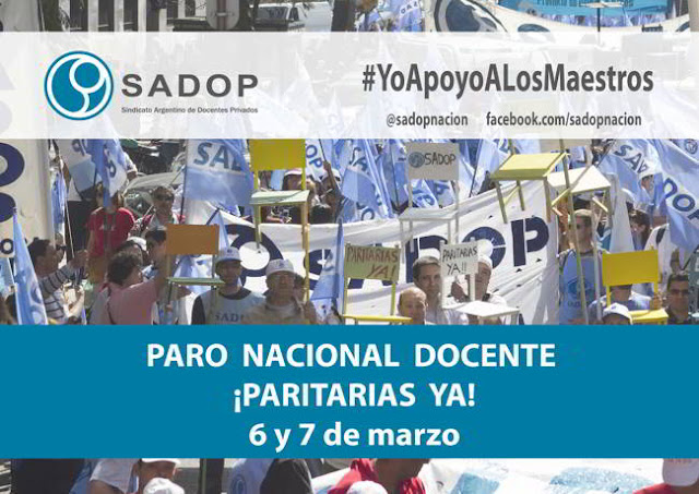 El Sindicato Argentino de Docentes Privados (SADOP) ratificó hoy la realización de un paro nacional de 48 horas con movilización para los días 6 y 7 de marzo próximos, que comprende a todos los niveles y modalidades del sistema educativo nacional, desde el inicial al superior universitario.