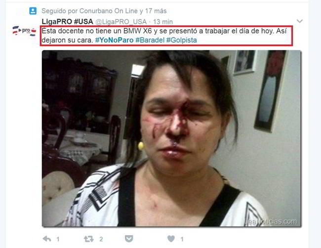 Ésta docente no tiene un BMW X6 y se presentó a trabajar el día de hoy. Así dejaron su cara. #YoNoParo #Baradel #Golpista pic.twitter.com/4yJyd7t03n— LigaPRO #USA (@LigaPRO_USA) 6 de marzo de 2017